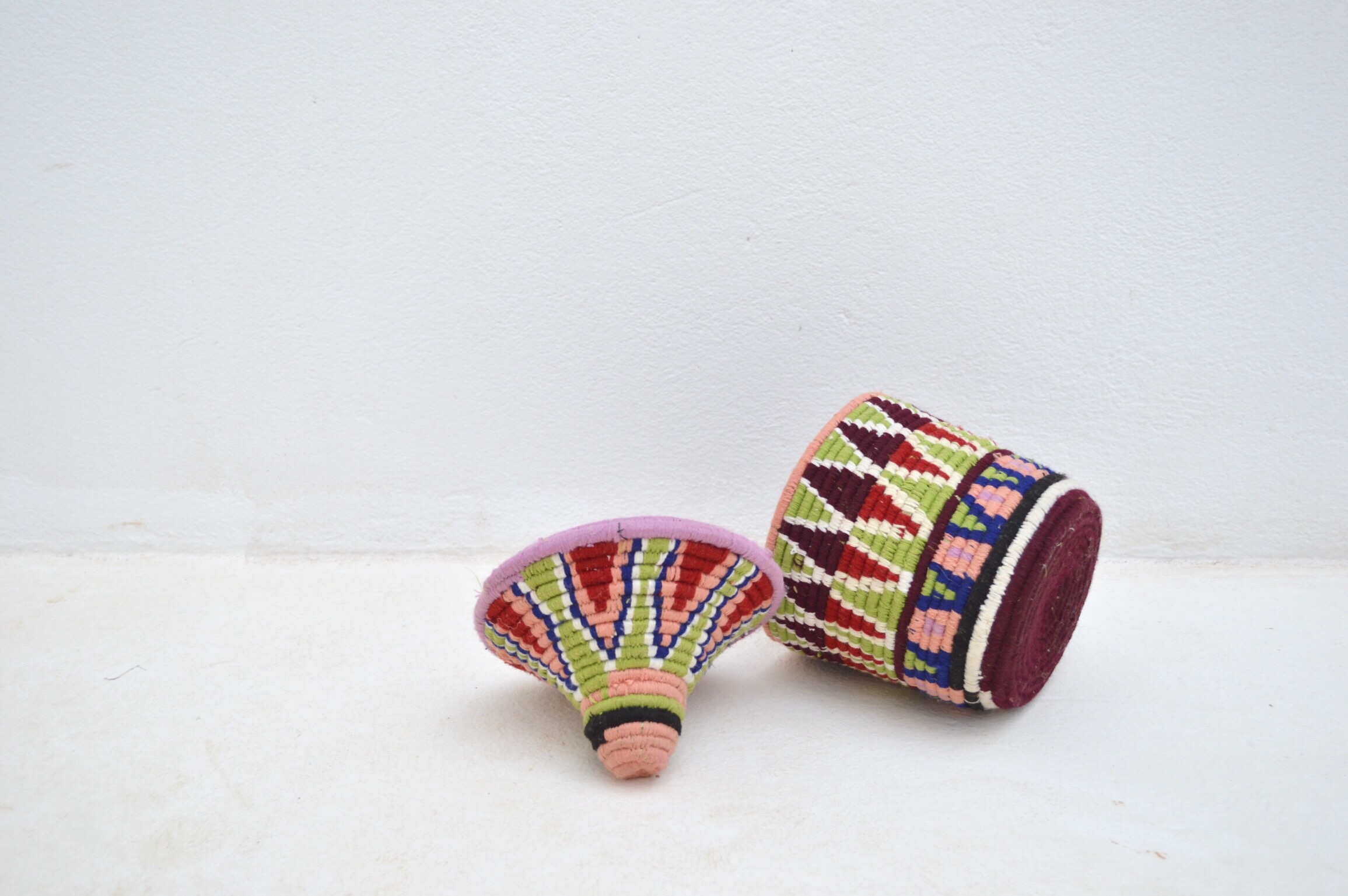 Handwoven Vintage Moroccan Berber Baskets were crafted to store "Khobz" Bread. Contrasting colours and Abstract designs create an individual unique item.
