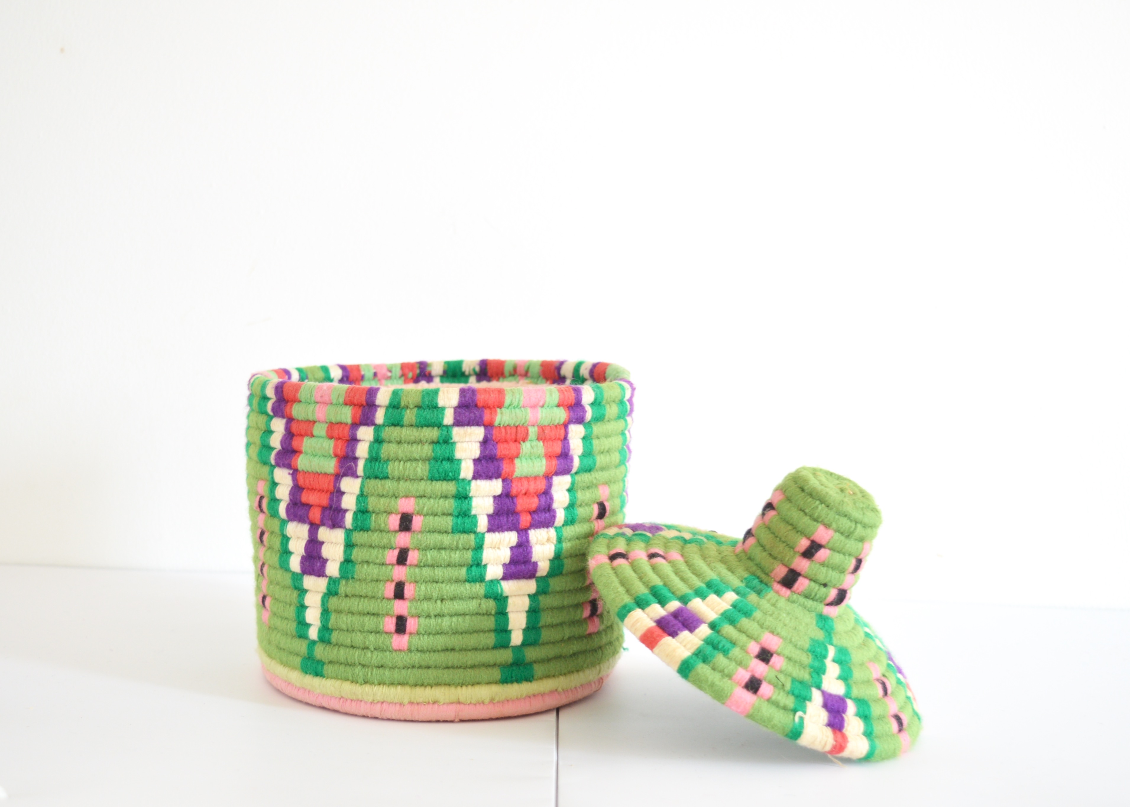 Handwoven Vintage Moroccan Berber Baskets were crafted to store "Khobz" Bread. Contrasting colours and Abstract designs create an individual unique item.