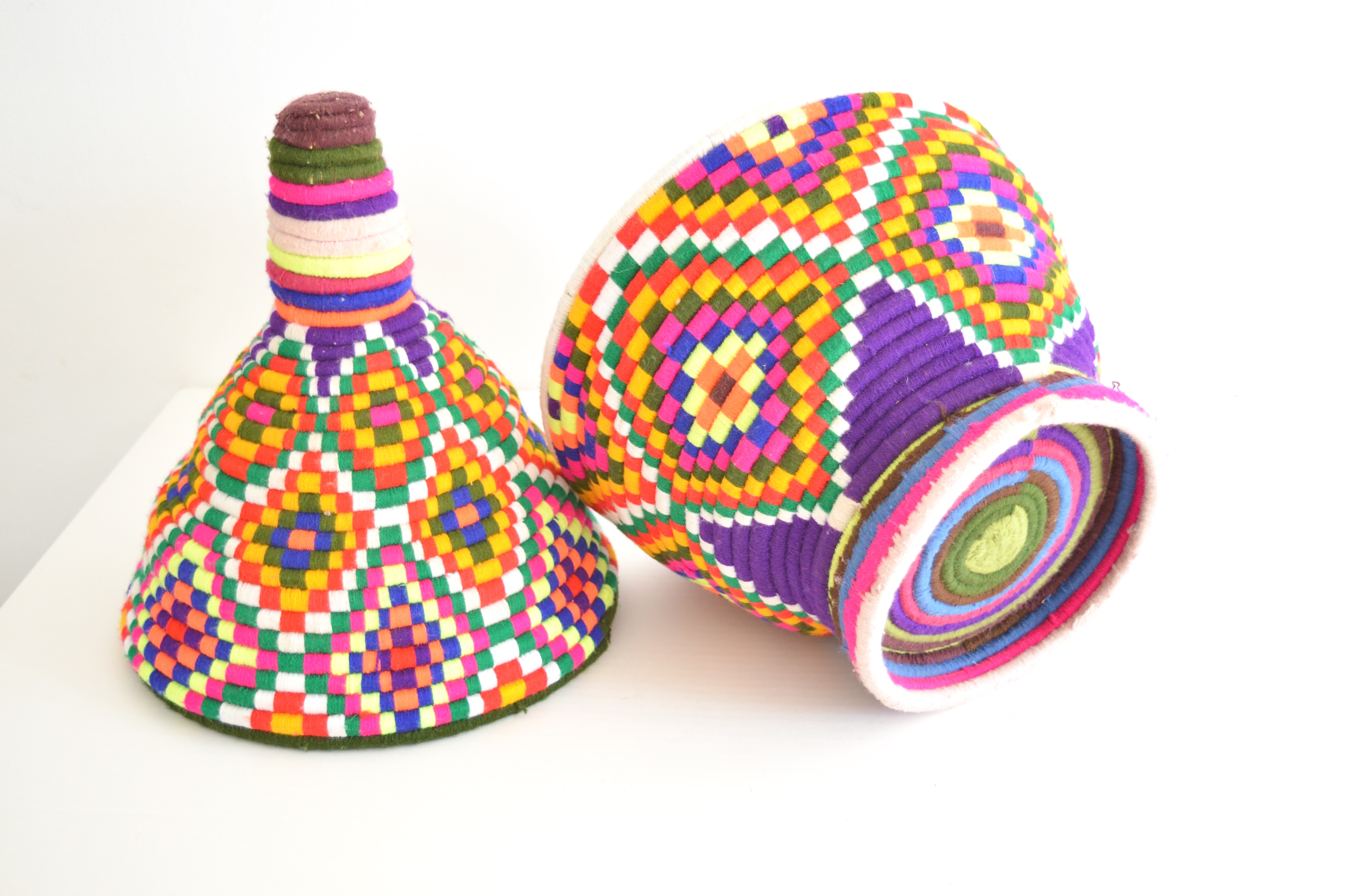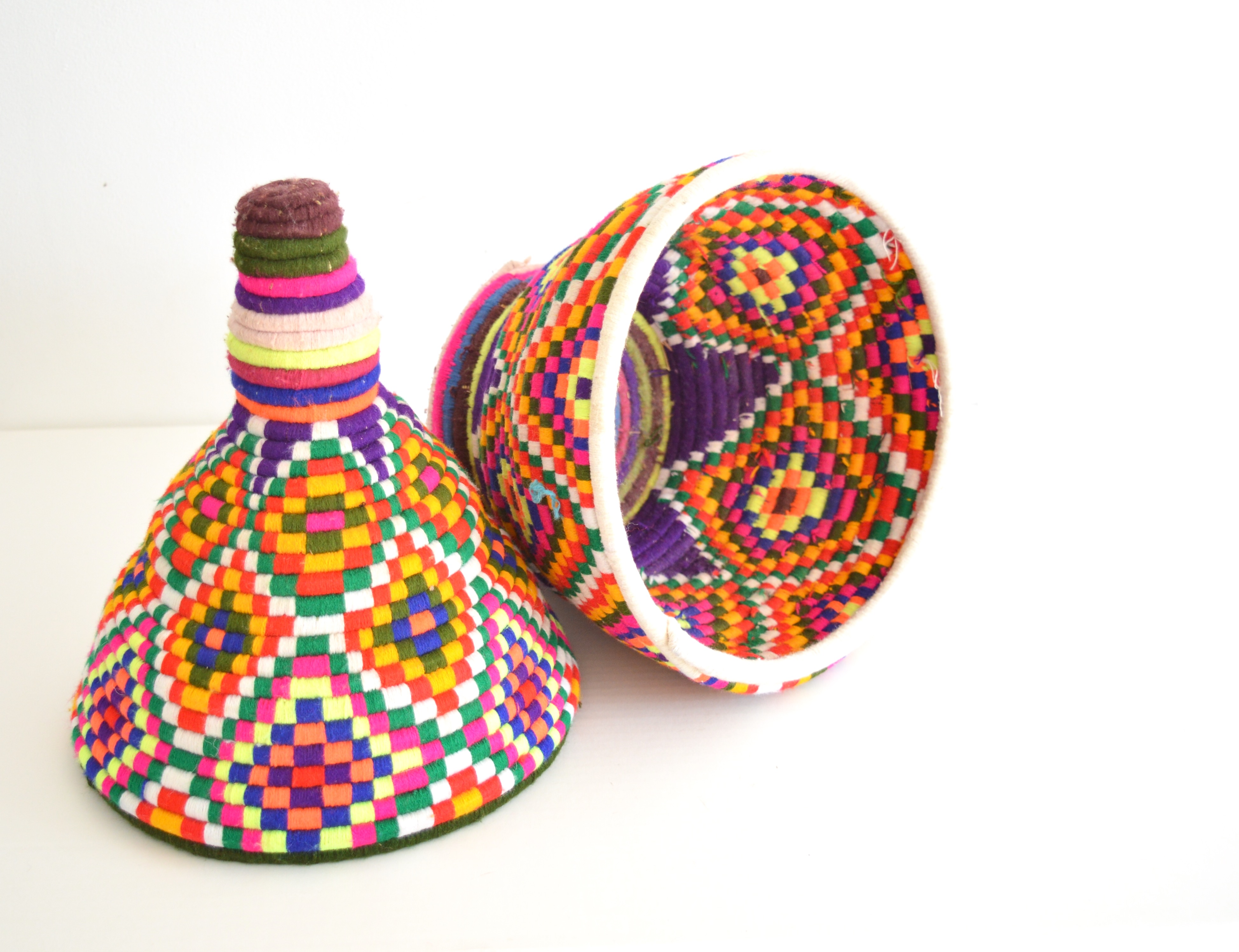 Handwoven Moroccan Berber Baskets were crafted to store "Khobz" Bread. Contrasting colours and Abstract designs create an individual unique item.
