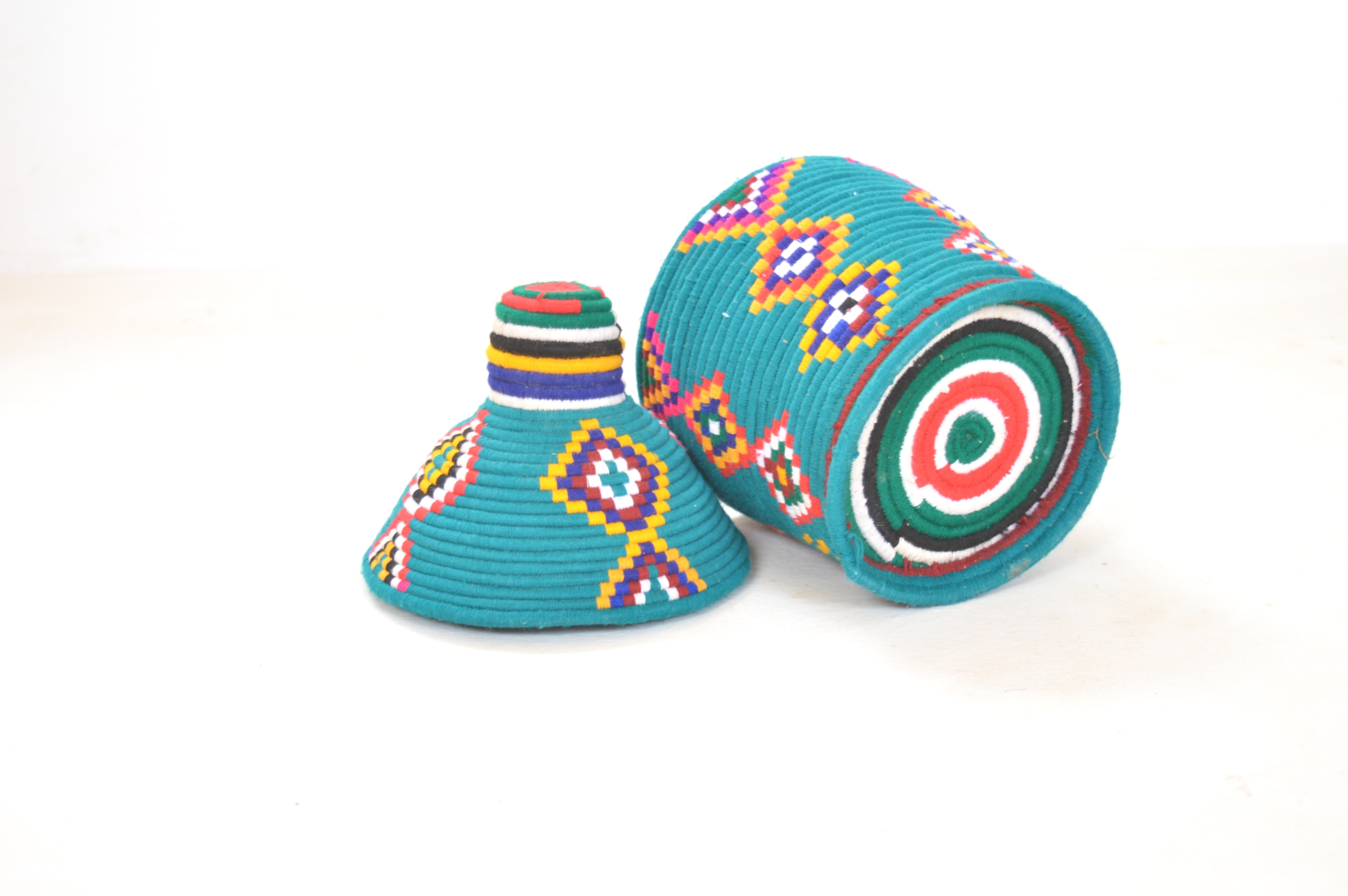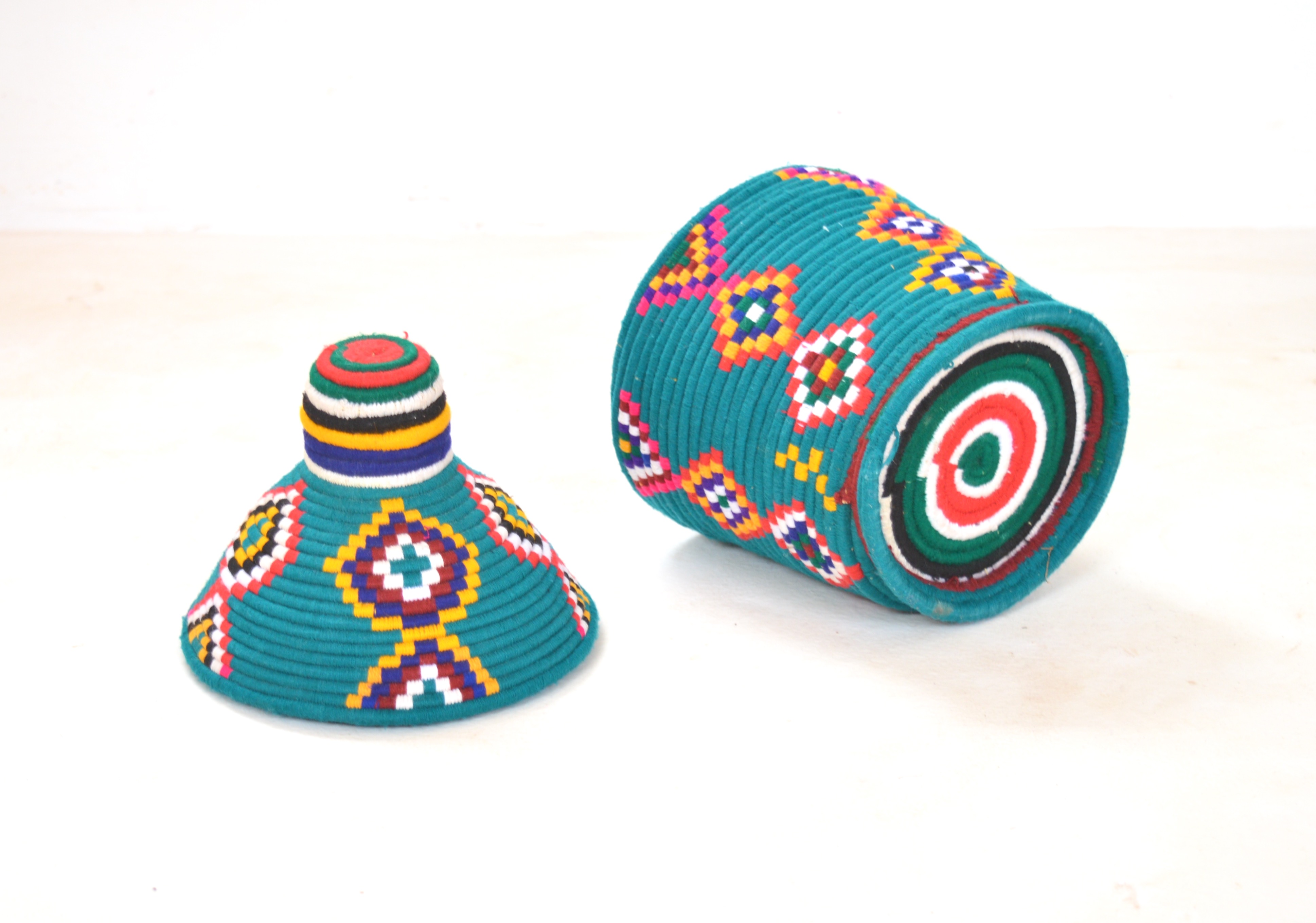 Handwoven Vintage Moroccan Berber Baskets were crafted to store "Khobz" Bread. Contrasting colours and Abstract designs create an individual unique item.