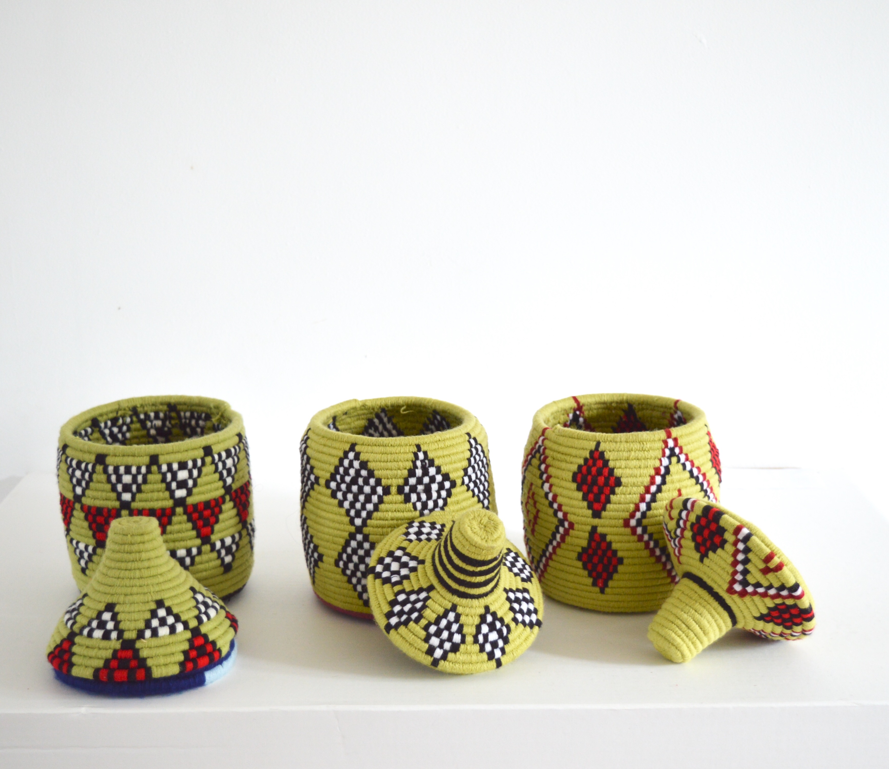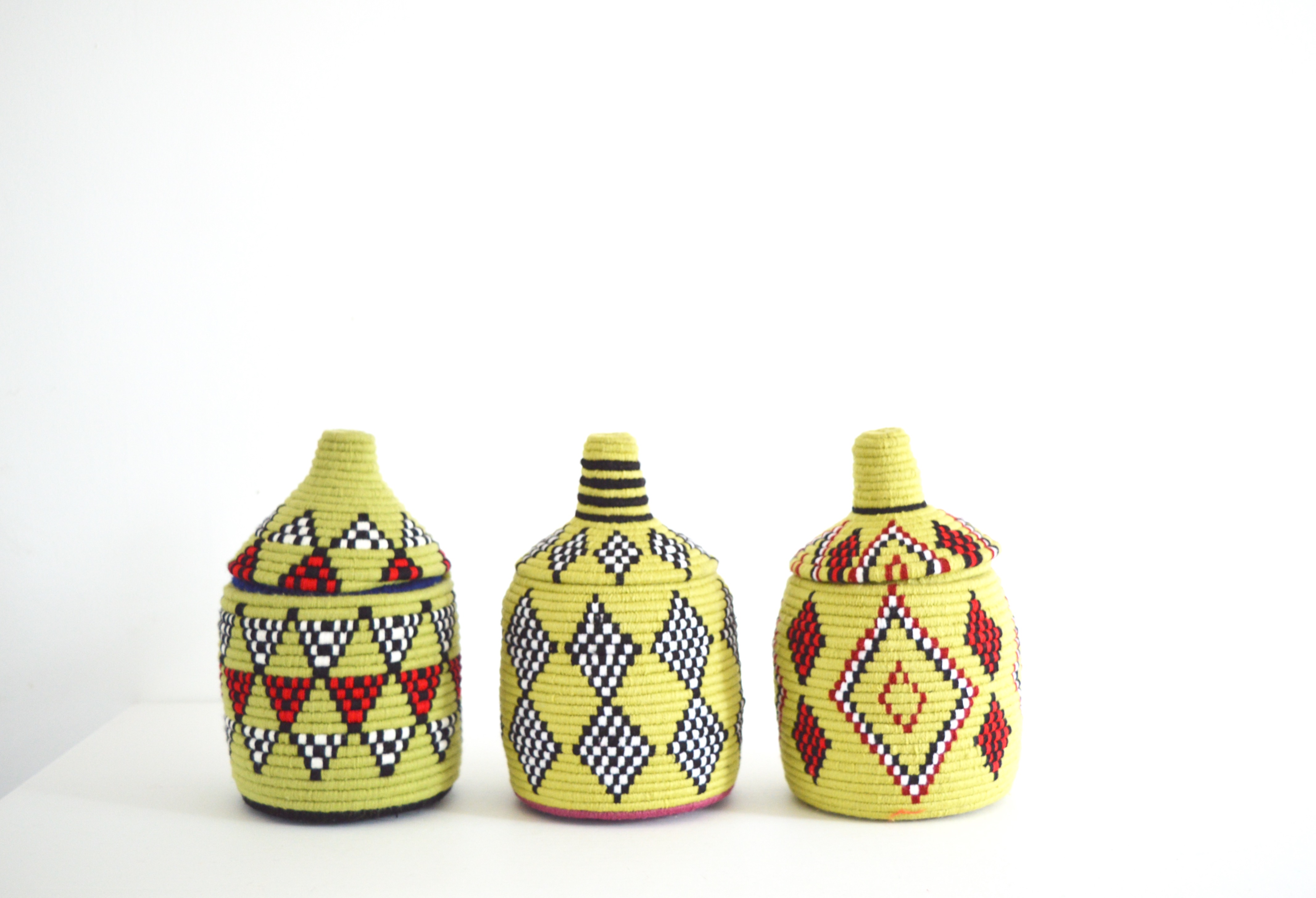 Trio of Handwoven Vintage Moroccan Berber Baskets were crafted to store "Khobz" Bread. Contrasting colours and Abstract designs create an individual unique item.