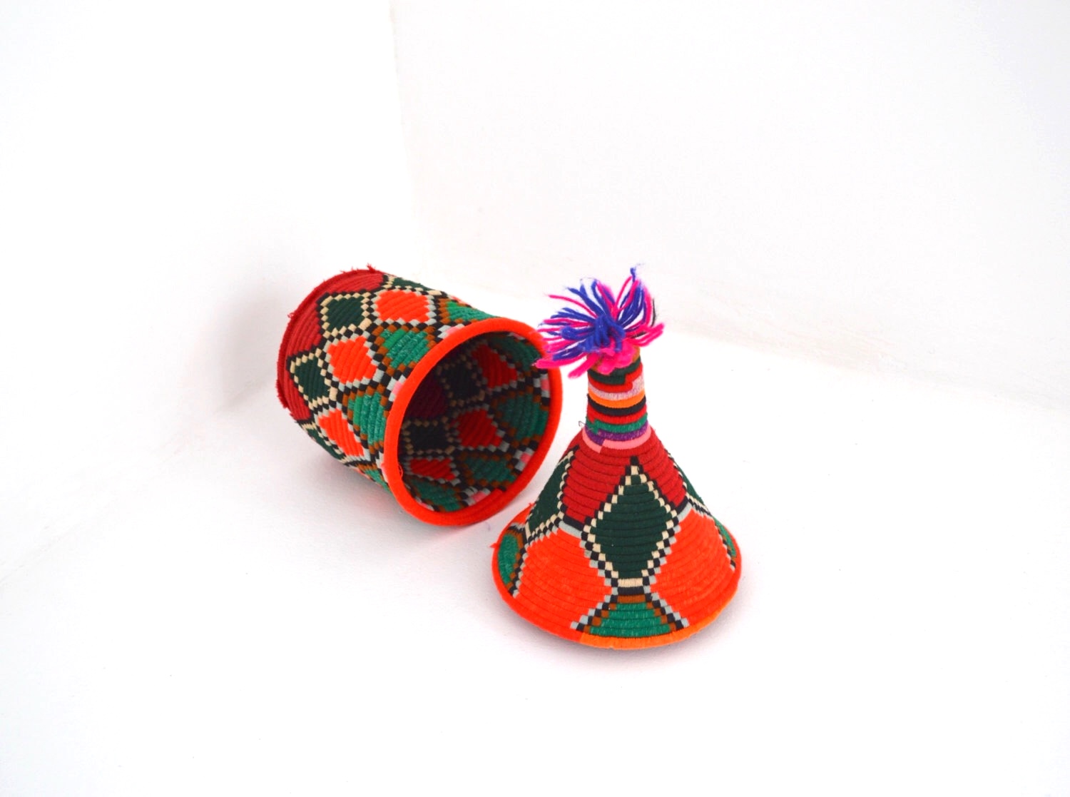 Handwoven Moroccan Berber Baskets were crafted to store "Khobz" Bread. Contrasting colours and Abstract designs create an individual unique item.