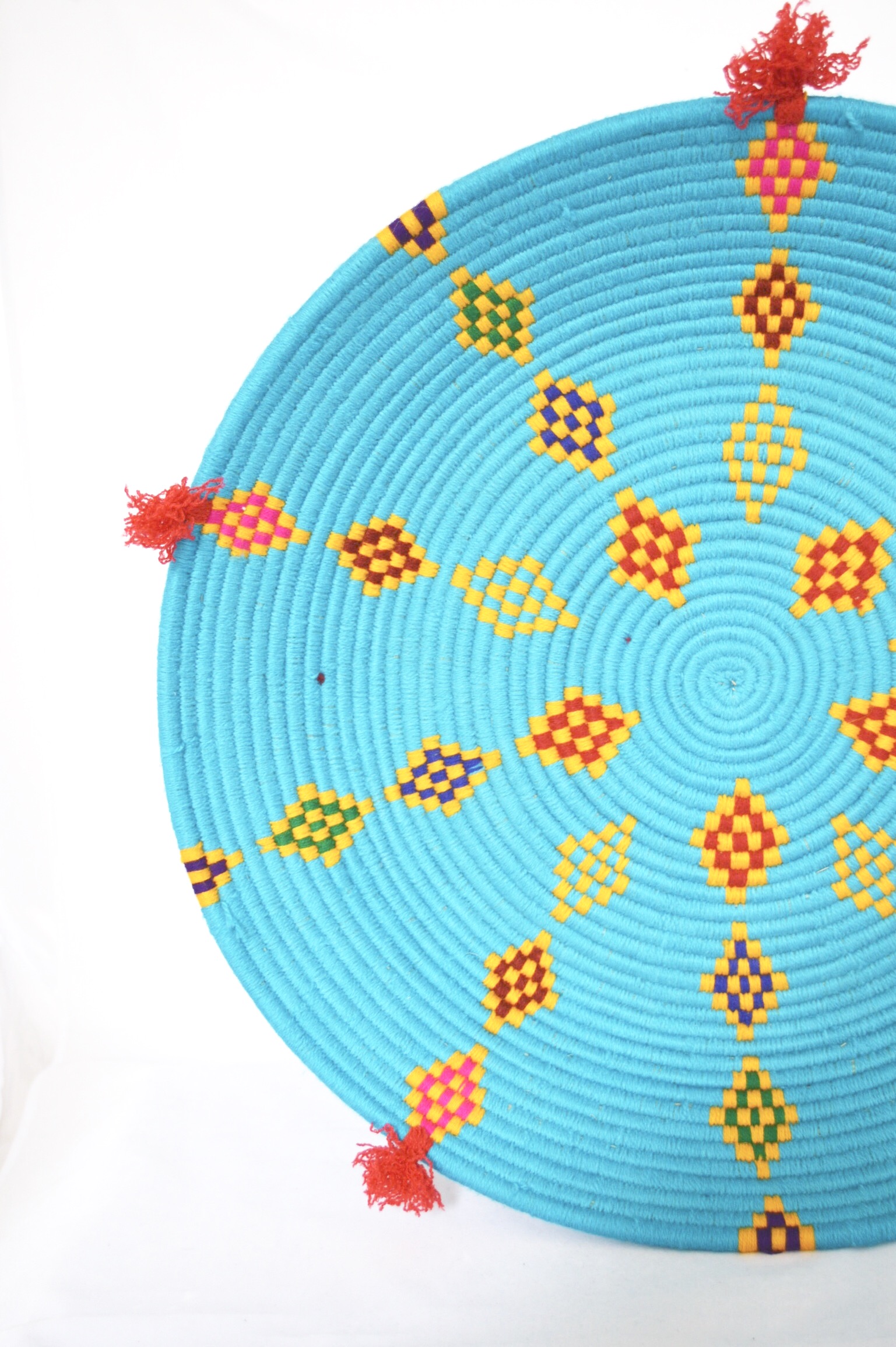 Handwoven Vintage Moroccan Berber Baskets Bowls were used to servie Bread Pancakes or as used for storage. Dazzling colours and Abstract designs create an individual unique item.