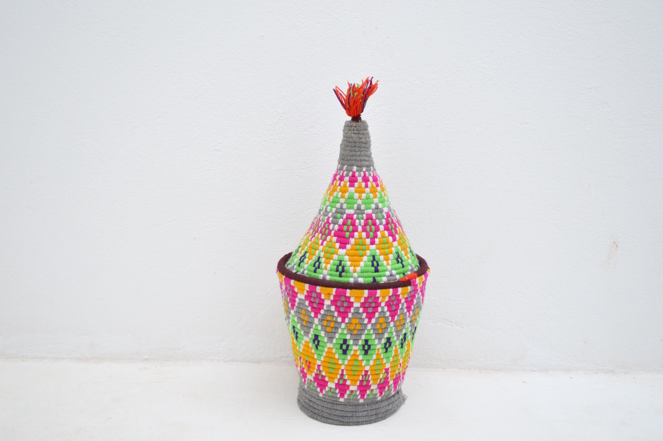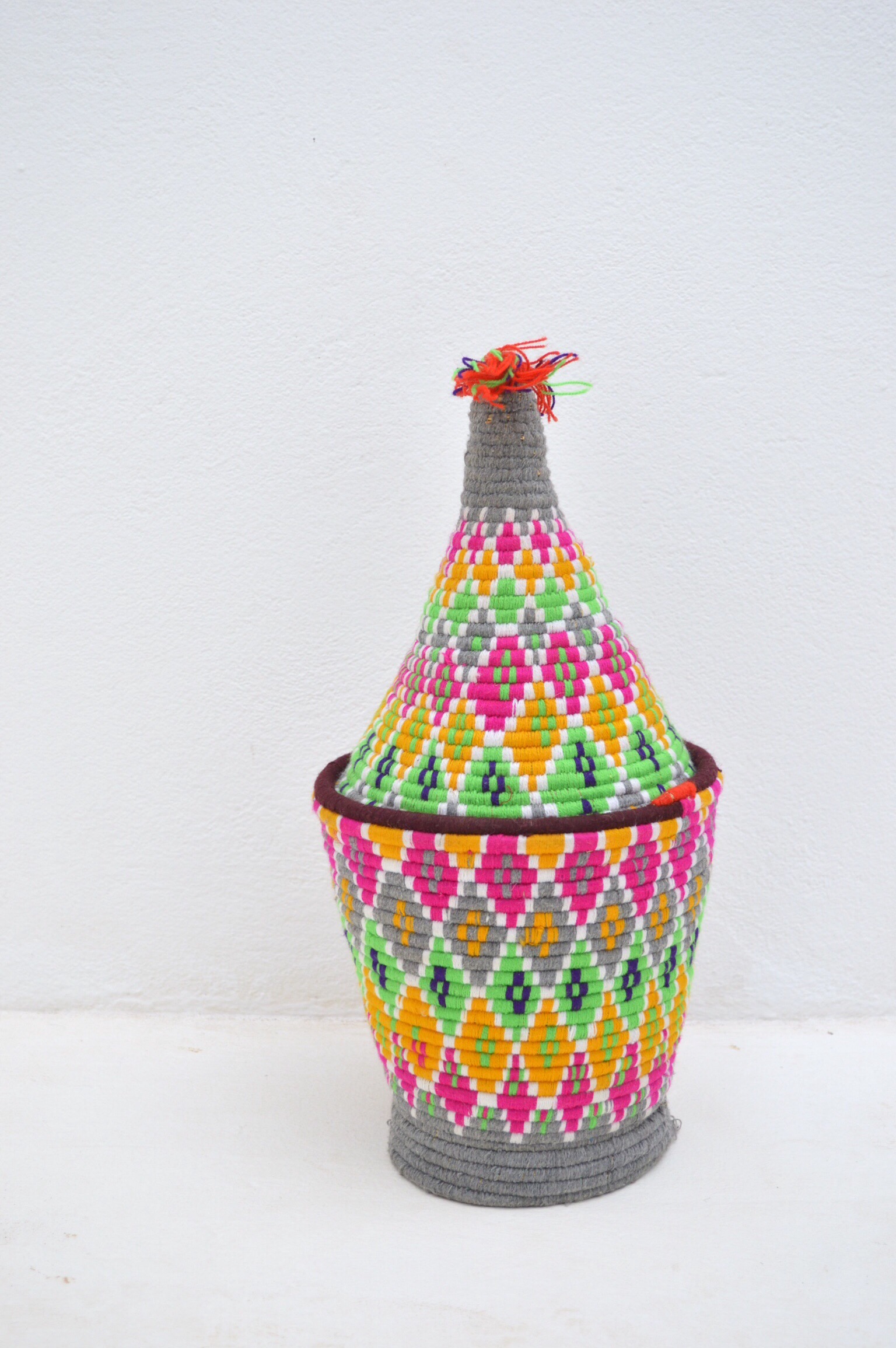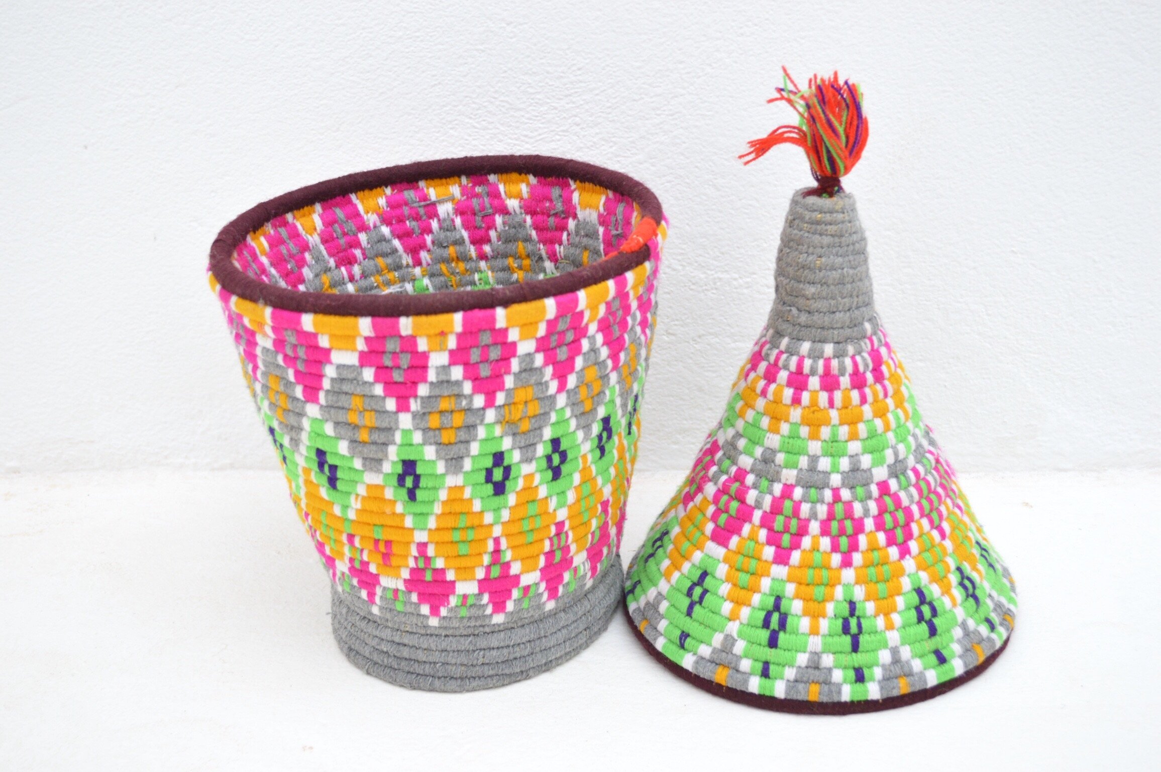 SOLD SOLD SOLD Berber Basket Handwoven Vintage Moroccan Berber Wool Lidded Basket with Pom Poms