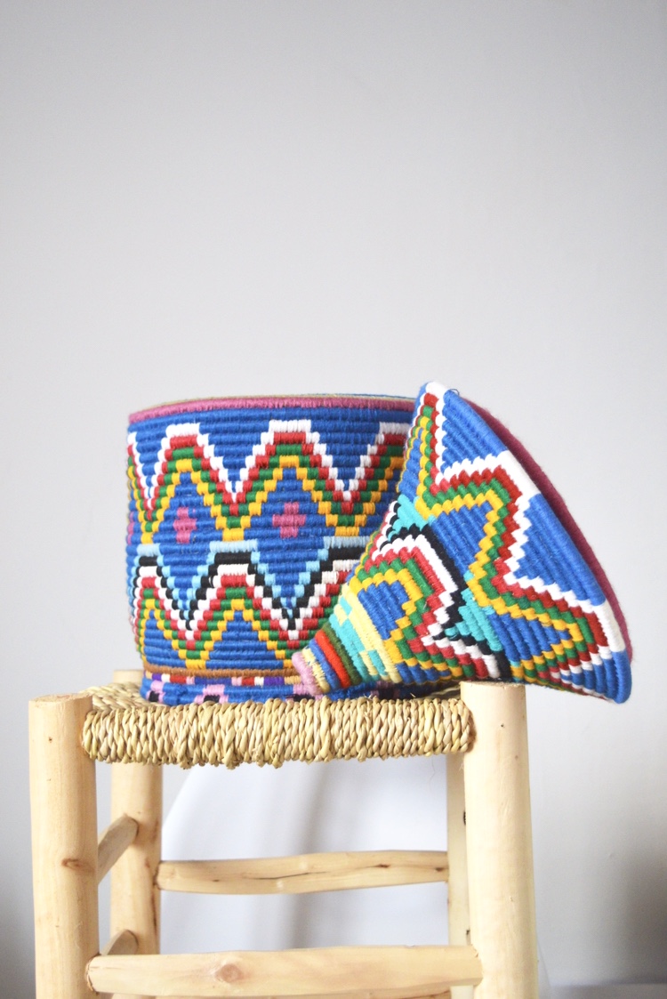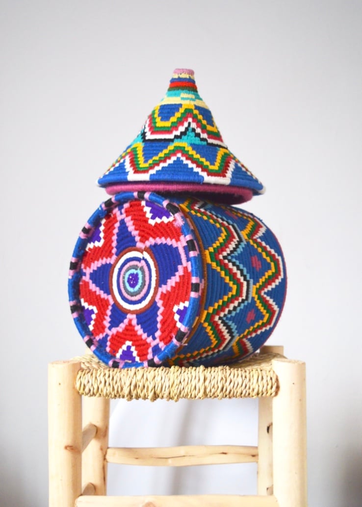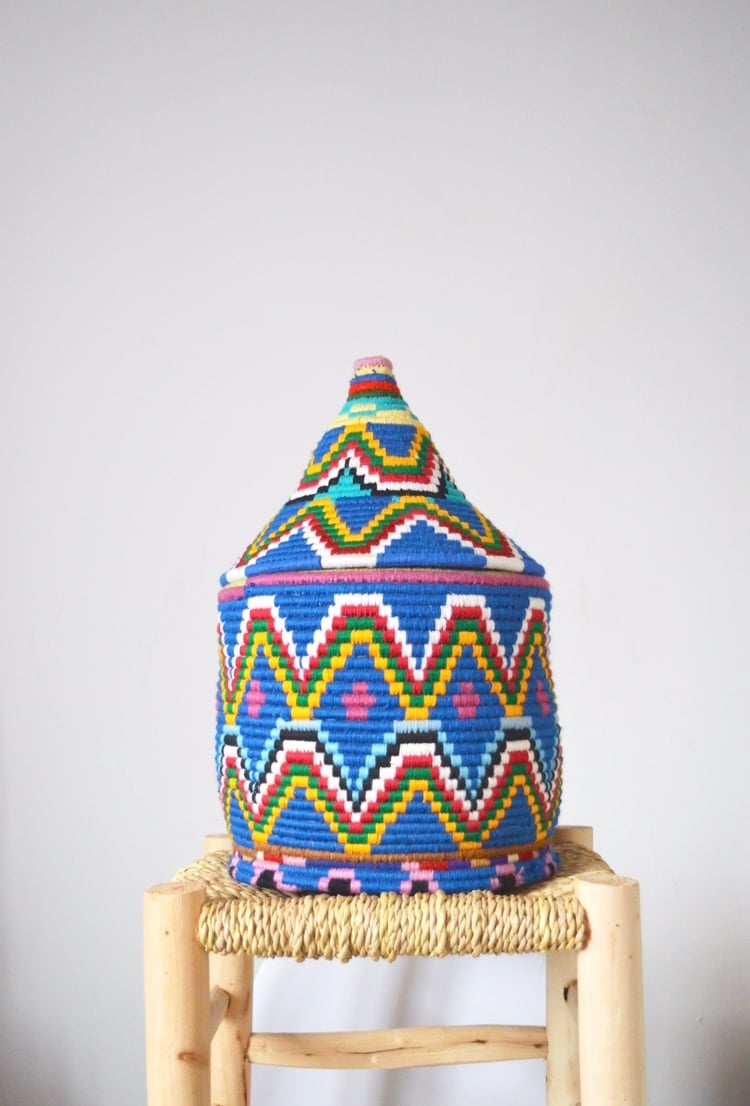 Handwoven Moroccan Berber Baskets were crafted to store "Khobz" Bread. Contrasting colours and Abstract designs create an individual unique item.