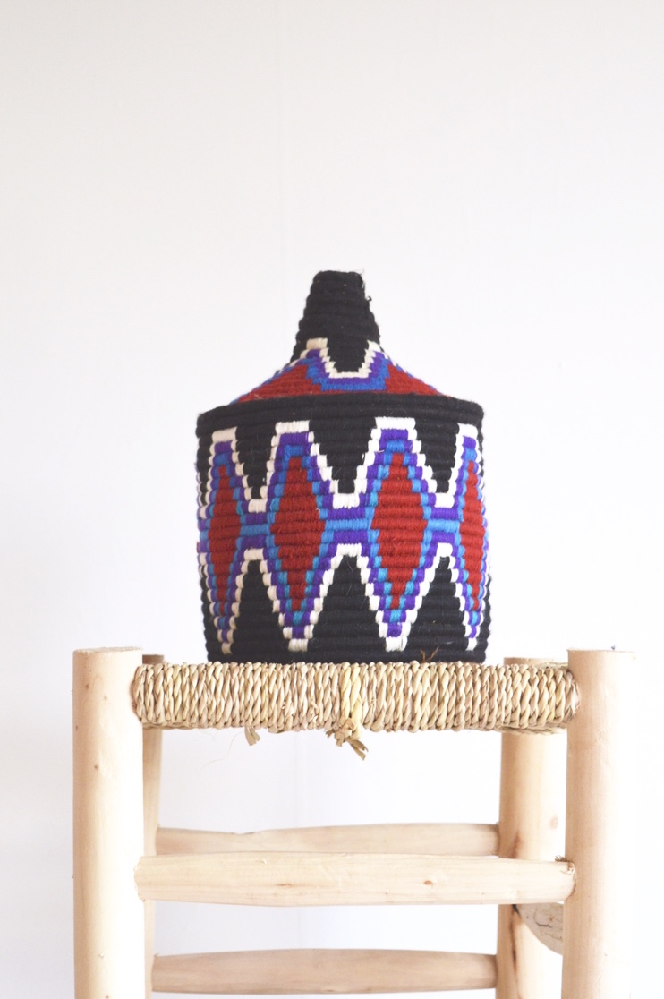 Handwoven Moroccan Berber Baskets were crafted to store "Khobz" Bread. Contrasting colours and Abstract designs create an individual unique item.