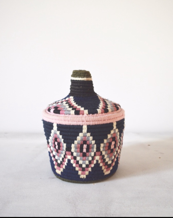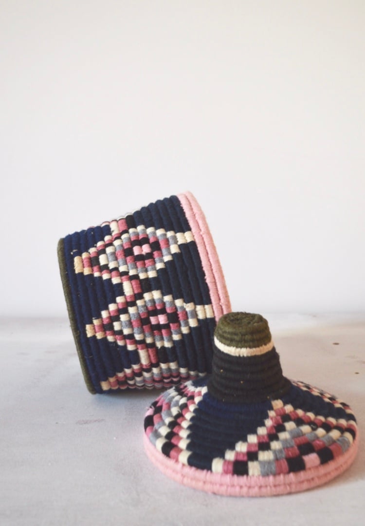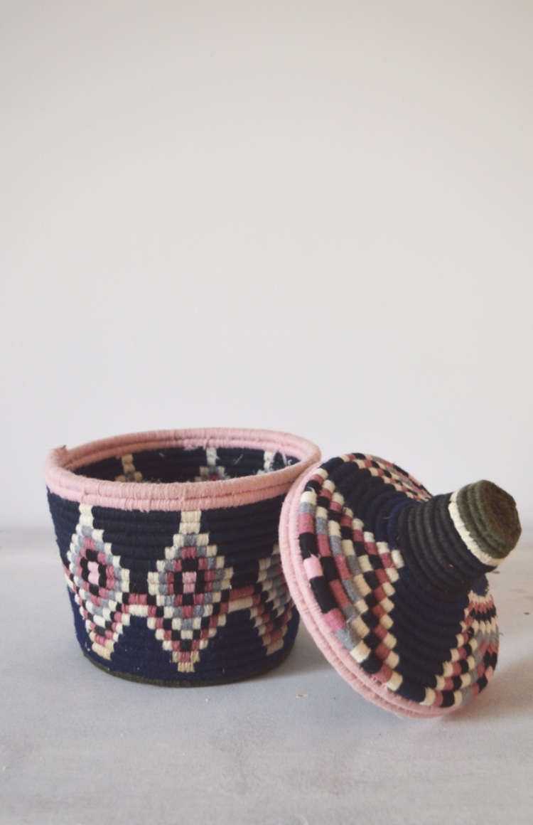 SOLD SOLD SOLD Berber Basket Handwoven Vintage Moroccan Berber Wool Lidded Basket with Pom Poms