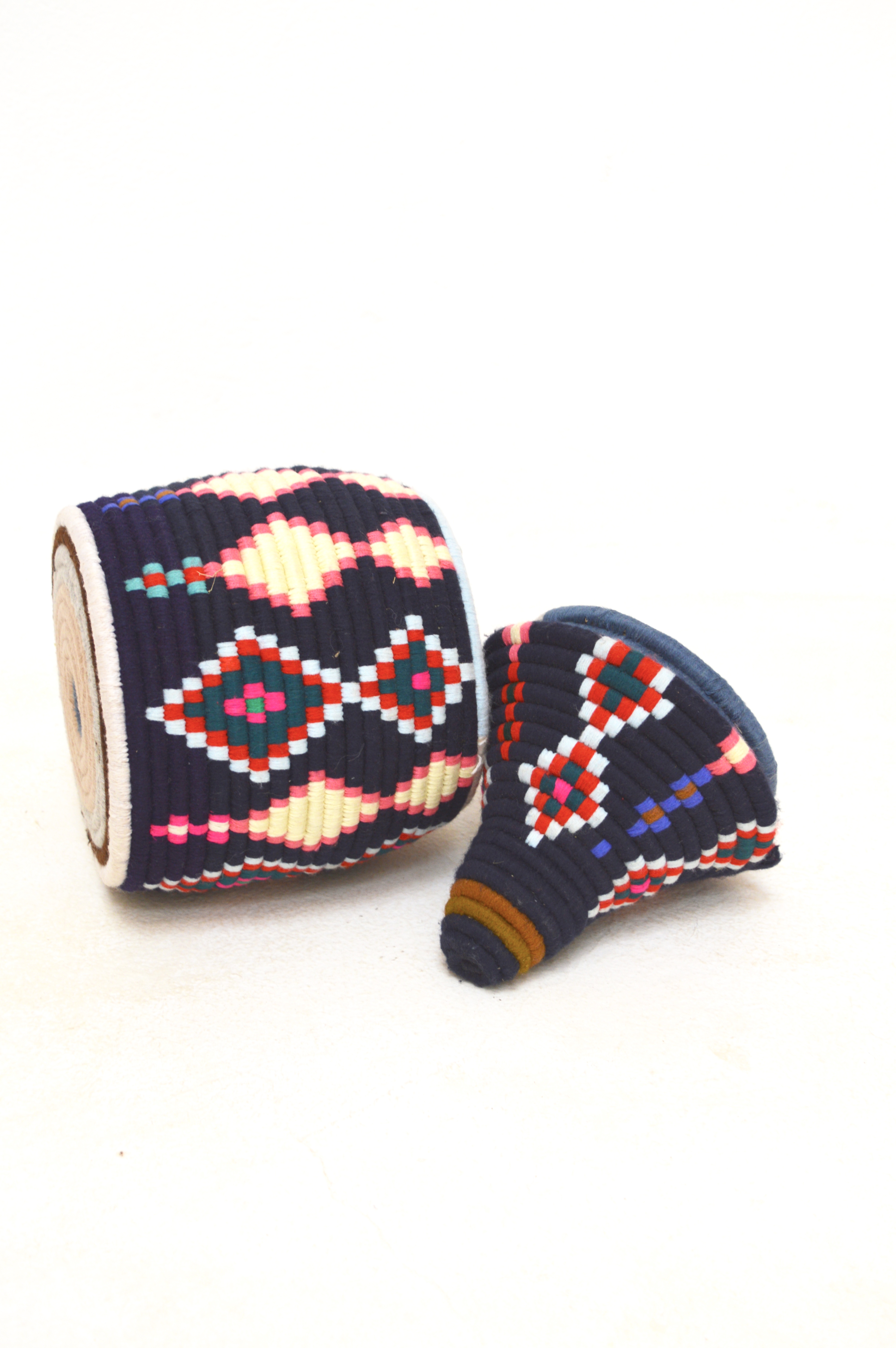 Handwoven Vintage Moroccan Berber Baskets were crafted to store "Khobz" Bread. A dazzling mix of vibrant contrasting colours and abstract designs create an individual one of a kind item. Decorative as well as functional, makes a unique statement piece in any interior.