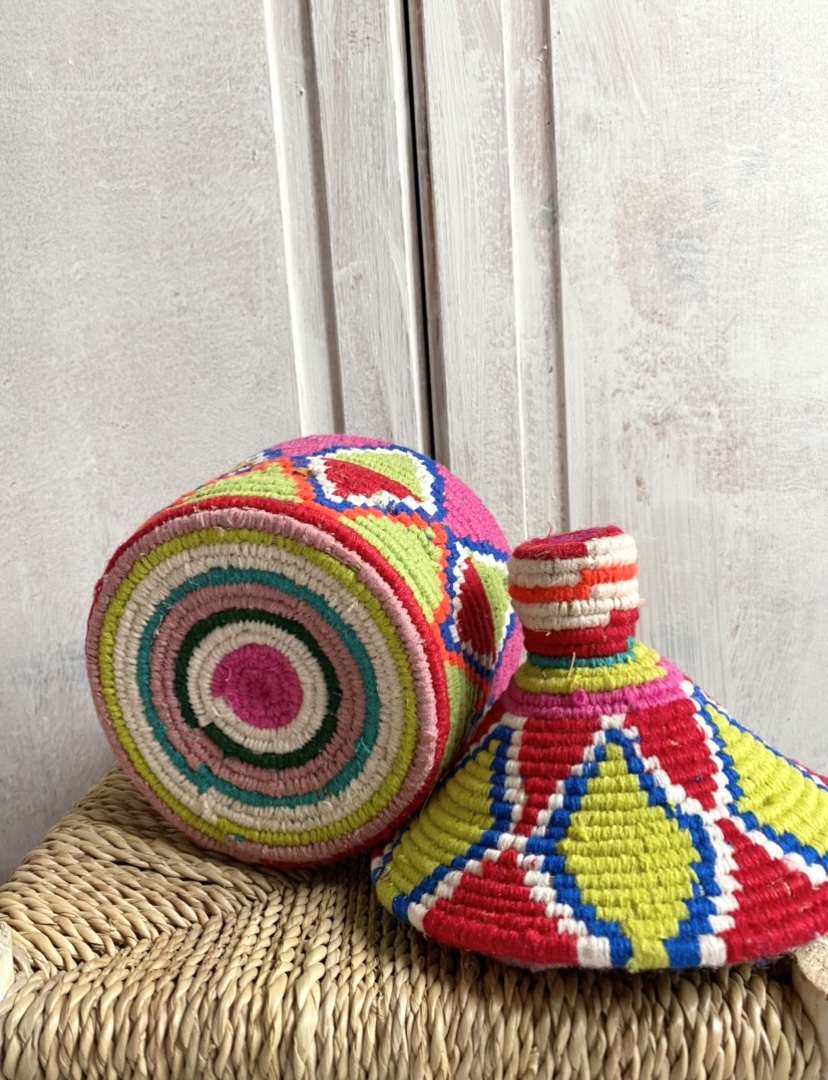 Handwoven Vintage Moroccan Berber Baskets were crafted to store "Khobz" Bread. Contrasting colours and Abstract designs create an individual unique item.