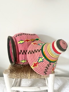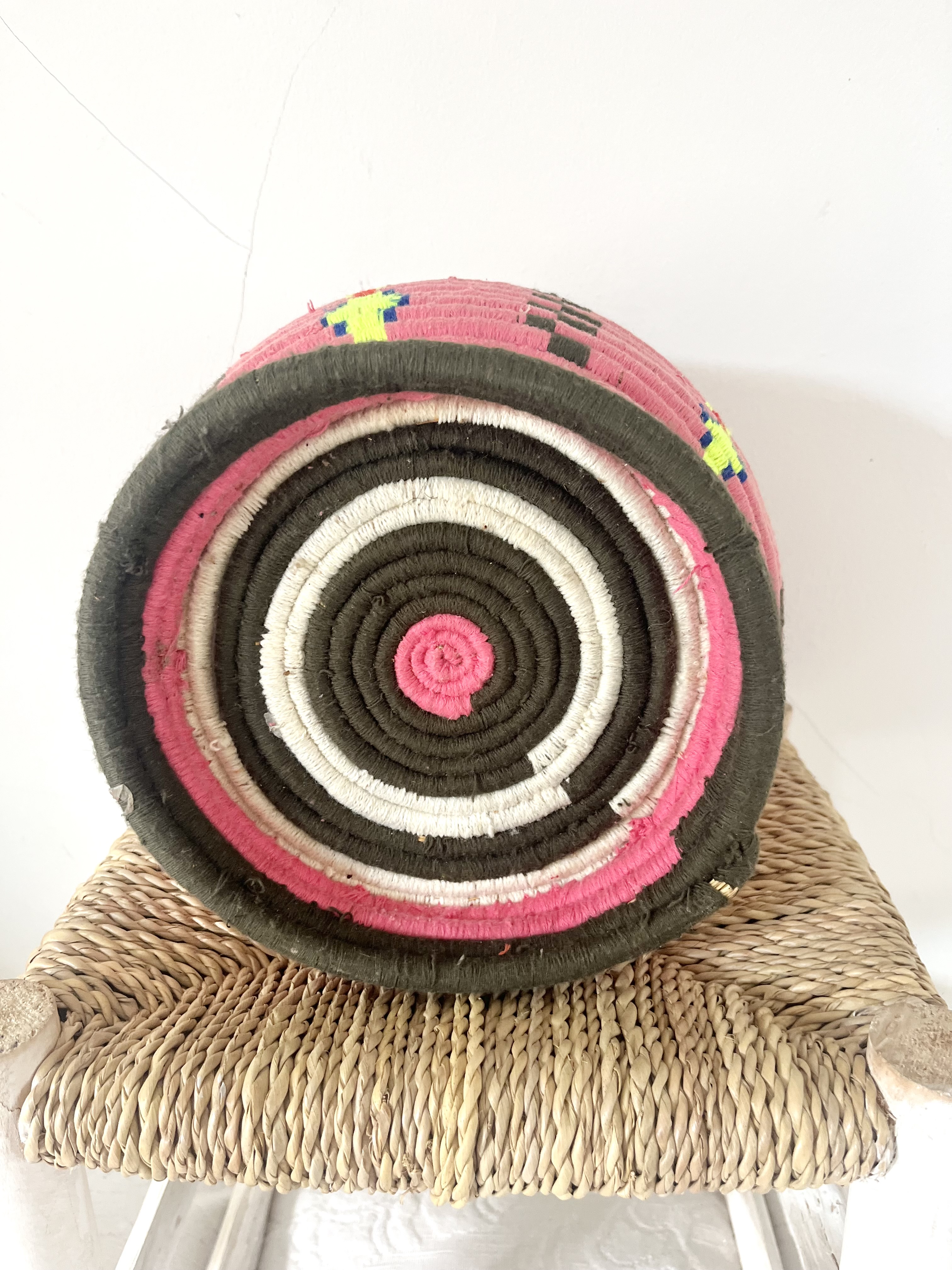 Handwoven Vintage Moroccan Berber Baskets were crafted to store "Khobz" Bread. A dazzling mix of vibrant contrasting colours and abstract designs create an individual one of a kind item. Decorative as well as functional, makes a unique statement piece in any interior.