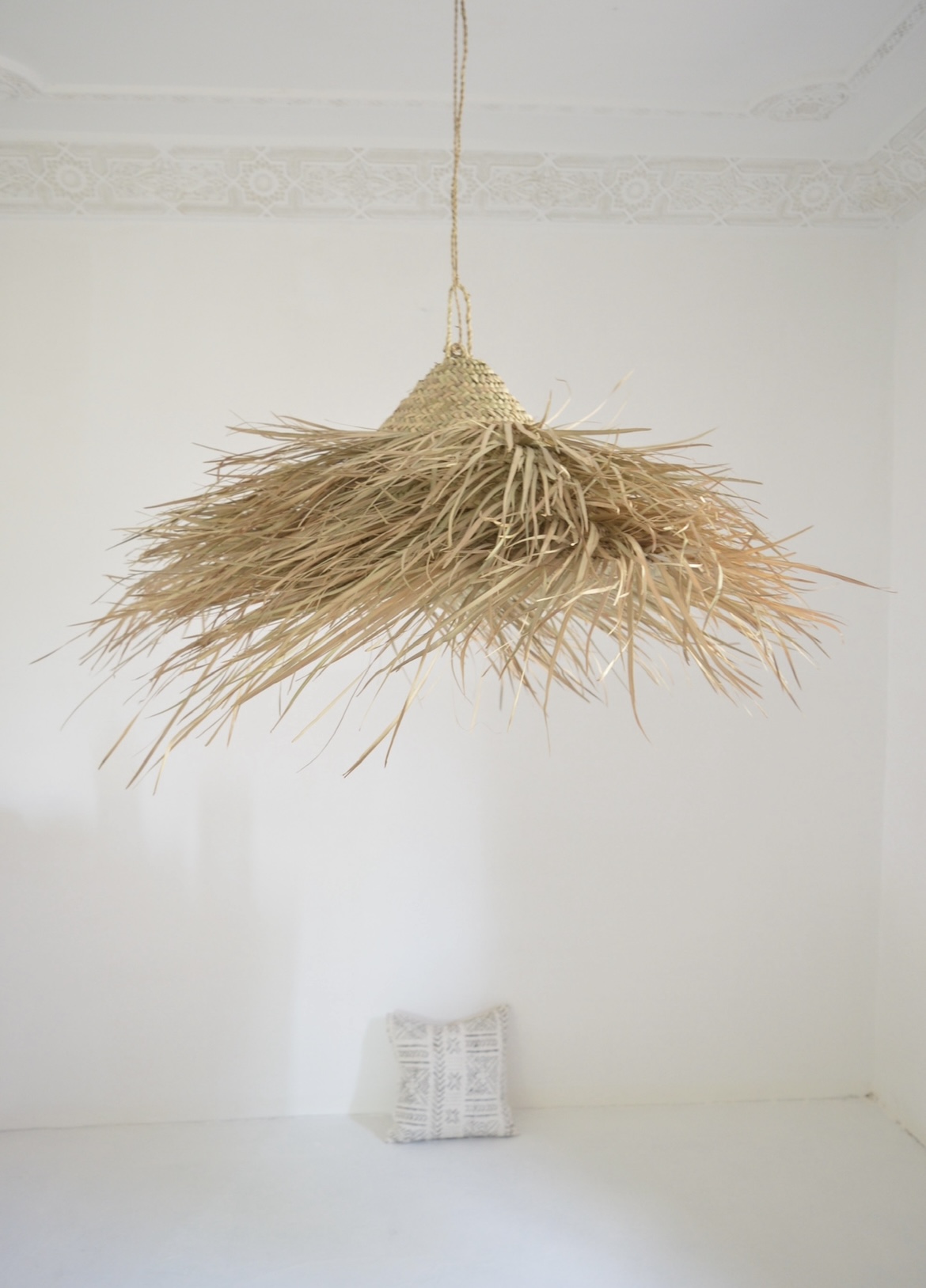 Moroccan rattan light, handwoven in Marrakech by happy Berber woman, Lots of shaggy Palm Leaf giving structure and texture on a hand woven base with Hanging loop.