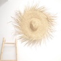 Stunning handwoven rattan sun hat handmade in Marrakech by happy Berber woman woven from Palm Leaf with fringe giving texture.
