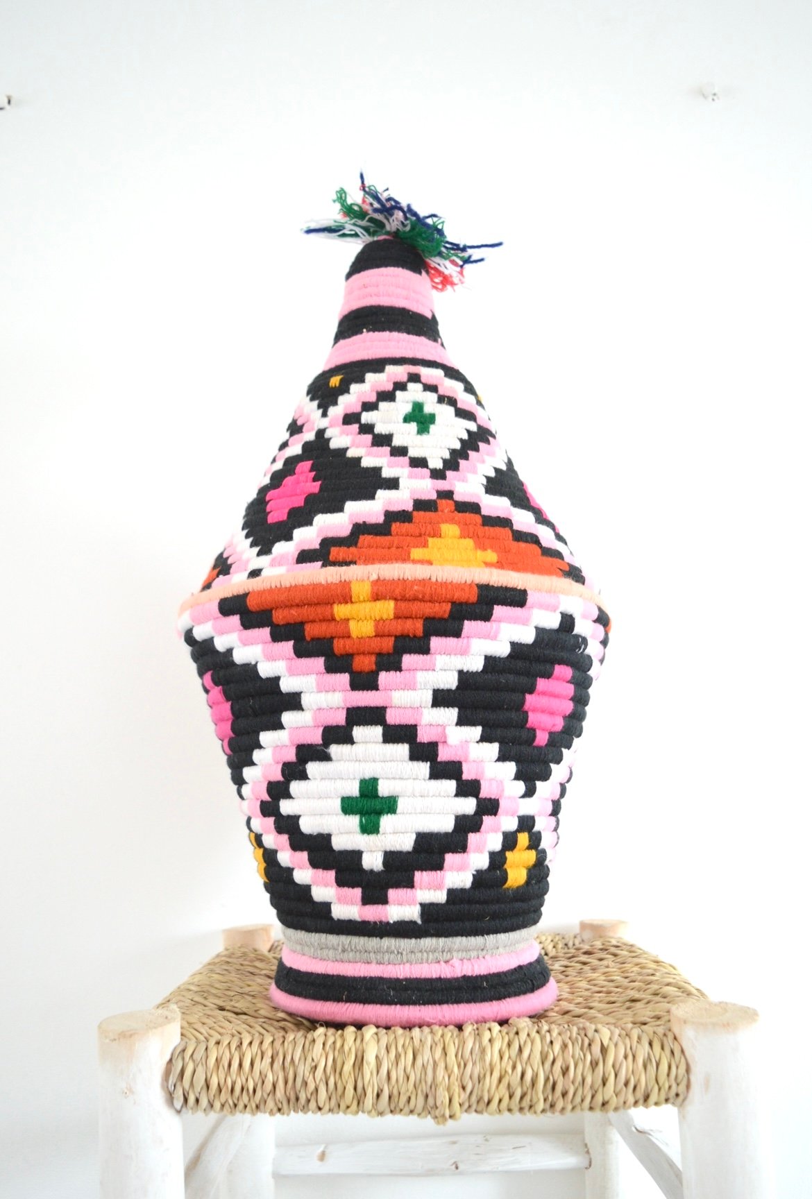 SOLD SOLD SOLD Berber Basket Handwoven Vintage Moroccan Berber Wool Lidded Basket with Pom Poms