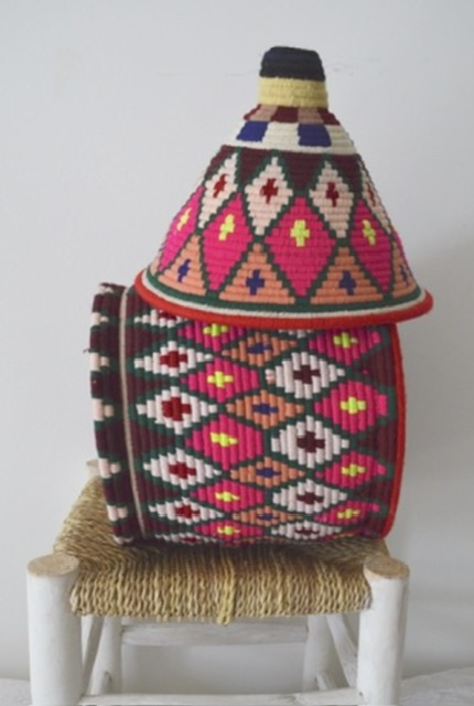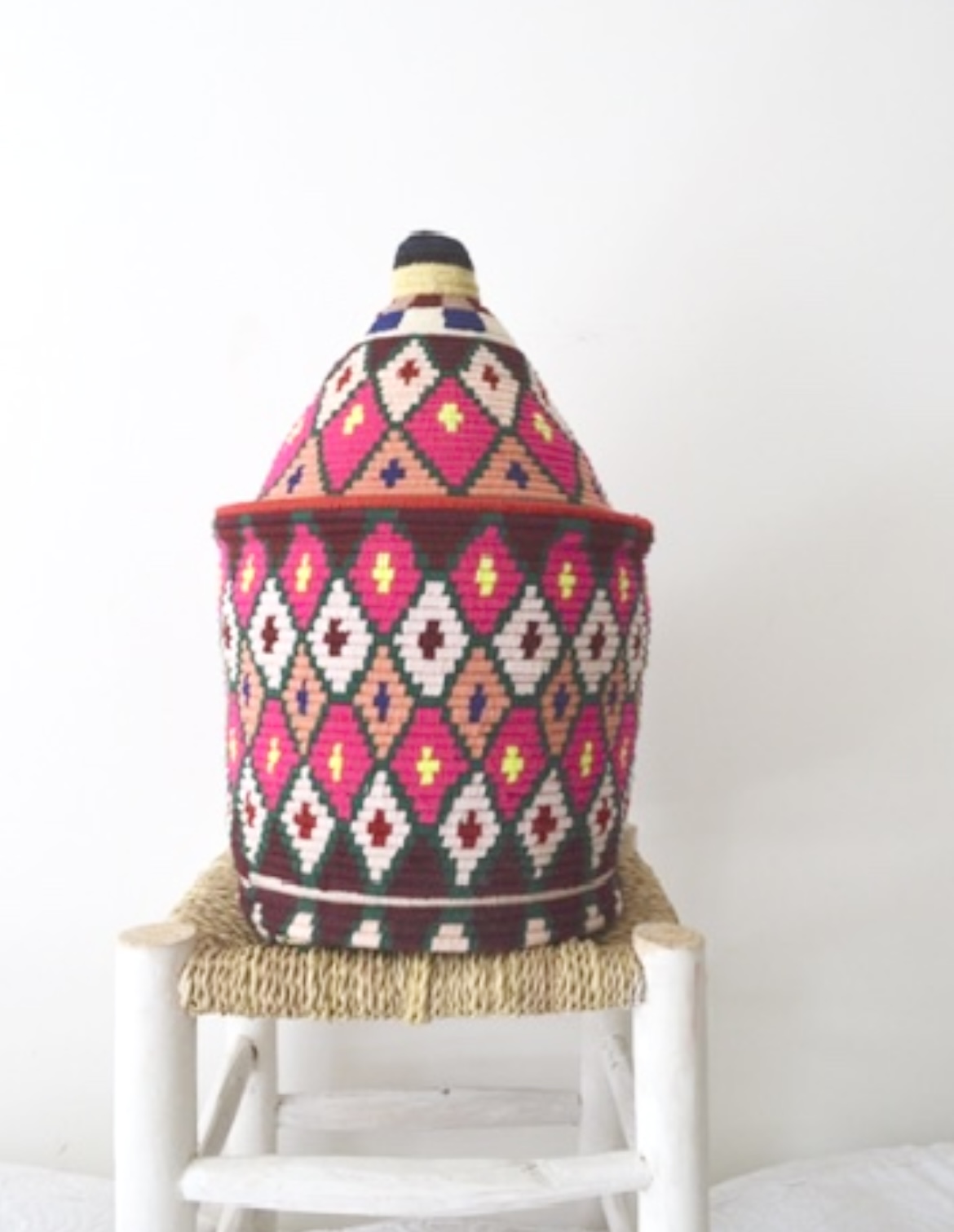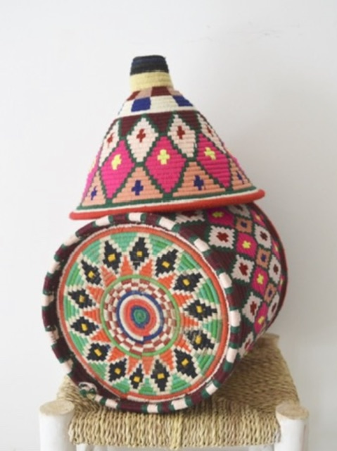 Vintage Handwoven Vintage Moroccan Berber Baskets were crafted to store "Khobz" Bread. Contrasting colours and Abstract designs create an individual unique item.